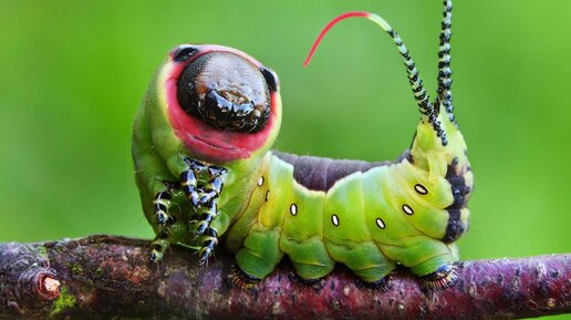10) Гусеница ночной бабочки «большая гарпия» (Cerura vinula). Гусеницы этих ночных бабочек очень яркие и пугающие своей внешностью, чего не скажешь о самой бабочке. Голова гусеницы выделена и имеет мощные жвала, красное кольцо и пару чёрных глаз. Сзади находятся два отростка, сформированных из последней пары ног. Когда гусенице угрожает опасность, она изгибается и демонстрирует своё «милое личико» и отростки на задней части, чтобы напугать врага. Если это не срабатывает, в ход идёт секретное оружие...