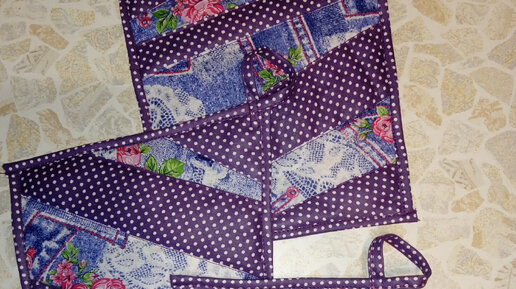 Для того, чтобы сделать прихватки, вам понадобится: цветные лоскуты, синтепон, однотонные трикотажные лоскуты для нижней части. У меня трикотажные обрезки от старой футболки фиолетового цвета. Они разного размера и формы. Получилось три заготовки для прихваток. Выкроила такого же размера детали из синтепона. Если нет синтепона, можно использовать старый свитер. Настрочила детали низа на синтепон. Для верха взяла лоскуты двух видов и рулик одной из этих расцветок. Рулик, или косая бейка выкраивается по косой, шириной около трёх сантиметров...