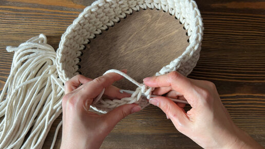 Всем доброго дня! У вас чешутся руки порукодельничать? И надо срочно чем-то себя занять? Вот вам идея, как за один вечер можно сделать стильную корзинку своими руками. Нам понадобится: Фанерное донышко Бельевая верёвка Крючок для вязания Также можно использовать специальные масло для дерева или морилку для покрытия фанерного донышка. Но можно этого и не делать. Если у вас нет такого донышко и нет возможности его приобрести, для корзинки можно просто связать из той же верёвки или джута. Фанерное донышко я решила покрыть специальным маслом с твёрдым воском для дерева фирмы «ГАППА»...