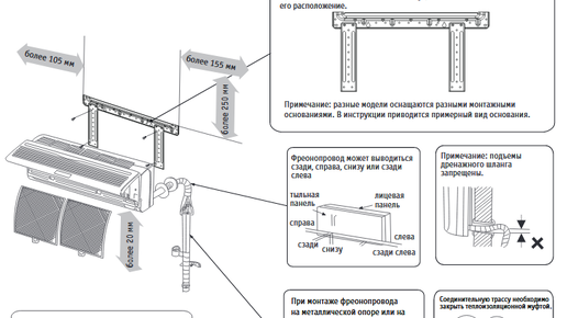 Инструкция по монтажу Выбор места монтажа внутреннего блока - Запрещается заграждать воздухозаборные и воздухораспределительные отверстия. - Перепад высот между внутренним и наружным блоками не должен превышать 5 м...