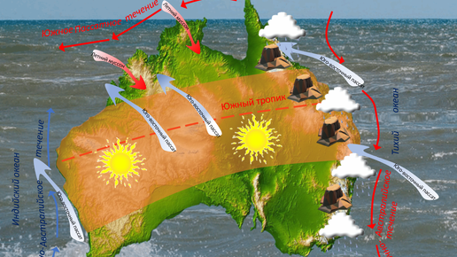 В Австралии преобладает жаркий сухой климат с большими годовыми и суточными колебаниями температуры. Почти вся Австралия находится в пределах летних изотерм 20—28 °С и зимних 12—24 °С. Лишь 1/3 ее территории получает достаточное или избыточное количество осадков. Процессы циркуляции воздуха, развивающиеся над континентом, порождают при отсутствии резких термических контрастов существенные различия в распределении осадков. Больше всего получает осадков северо-восточное побережье, где в районе Кэрнса зарегистрирована максимальная сумма осадков, превышающая 4000 мм...