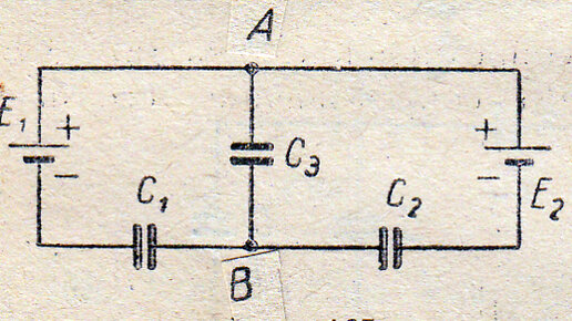 Для школьников. Обращаю внимание на то, что на рисунке буквами Е обозначены ЭДС источника постоянного напряжения, а не напряжённость поля. Сразу можем сказать, что левая обкладка первого конденсатора заряжена отрицательно, так как она присоединена к отрицательному полюсу источника. По этой же причине отрицательно заряжена правая обкладка второго конденсатора. Значит, правая обкладка первого конденсатора и левая обкладка второго конденсатора заряжены положительно. Верхняя обкладка третьего конденсатора...
