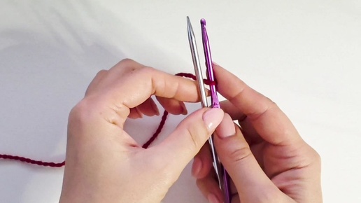 Суть способа: набор петель выполняется с помощью крючка и спицы одновременно, без предварительной подготовки цепочки из воздушных петель. В примере красная нить – бросовая нить, серая нить – основная нить, которой вяжется изделие. Для начала нужно закрепить на крючке скользящую петлю из бросовой нити. Прикладываем спицу к крючку поверх бросовой нити. Придерживаем спицу левой рукой, правой держим крючок. Крючком подхватываем бросовую нить, которая находится за спицей и протягиваем в скользящую петельку...