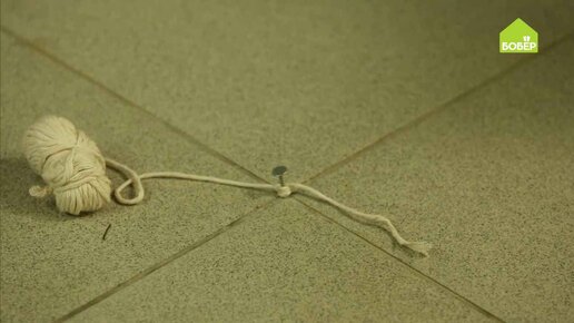 Мастер на все руки Василий Арисов покажет, что нужно делать, если необходимо прочертить длинную и ровную линию, но под рукой нет линейки соответствующего размера. Вбейте гвоздь в то место, откуда будете начинать разметку. Привяжите к гвоздю строительную верёвку. При помощи рулетки отмерьте от гвоздя нужное расстояние. В данном случае оно составляет 5 м. Сделайте отметку на полу...