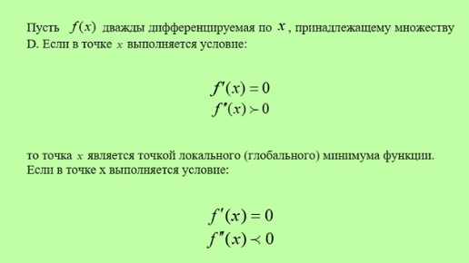 Для исследования функции на экстремум при помощи производной второго порядка нужно выполнить следующие шаги: 1. Найдите первую и вторую производные функции . Обозначим их как f '(x) и f ''(x) соответственно. Используем теоретической обоснование - необходимое условие экстремума функции одной переменной: 2. Найдите точки, где первая производная равна нулю или не существует. Это могут быть точки экстремума или точки перегиба. 3. Найдите значения второй производной в найденных точках и классифицируйте их используя достаточное условие экстремума...