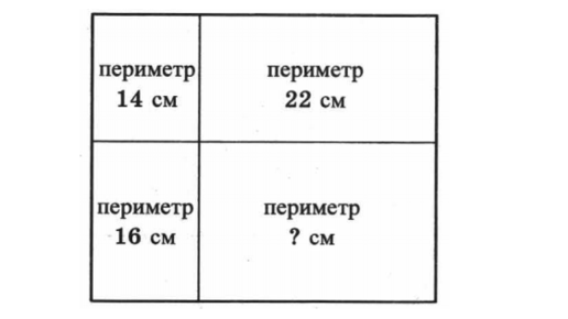 Рассмотрим задачу, предложенную на олимпиаде пятиклассникам в 2018 году и её «взрослое» решение. 2018 5-й класс. Математика. 25 вариантов. Задание 14. Прямоугольник разбили на четыре маленьких прямоугольника, как показано на рисунке. Периметры трёх маленьких прямоугольников равны 16 см, 14 см и 22 см. Найдите периметр четвёртого маленького прямоугольника. Запишите решение и ответ. Решение. Обозначим длины сторон прямоугольников как показано на рисунке ниже. Используя эти обозначения, можно записать равенства: В задании нужно найти периметр 2x + 2y...
