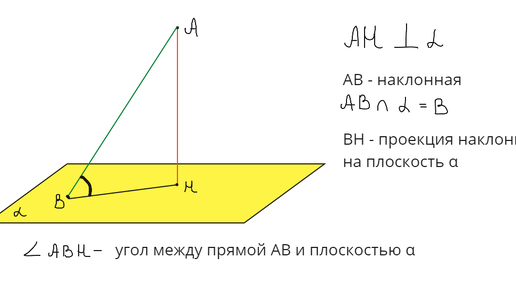 Разберем сегодня, как находится угол между прямой и плоскостью. Для этого построим плоскость α и проведём к ней перпендикуляр АН. Далее от точки А к плоскости α проведем наклонную. Пусть эта наклонная пересекает плоскость в точке В. Теперь построим проекцию наклонной АВ на плоскость α - это отрезок ВН...