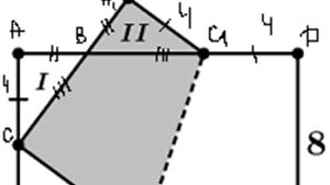 Прямоугольный лист бумаги согнули, совместив вершину с серединой противоположной короткой стороны, как показано на рисунке. Оказалось, что треугольники I и II равны. Найдите длинную сторону прямоугольника, если короткая равна 8. При сгибании точка D перешла в А1, точка К в С. Поэтому четырехугольники симметричны относительно пунктирной линии и А1С=DК=8. Треугольники I и II равны, поэтому АС=А1С1=4, исходя из симметрии А1С1=С1D=4. АВ=А1В, ВС1=ВС, а сумма АВ+ВС1=А1В+ВС=8 Ответ 12 Прямоугольный лист...