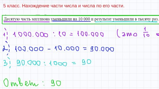Десятую часть миллиона уменьшили на 10 000 и результат уменьшили в тысячу раз. Сколько получили? Решение: Обратите внимание, мы "разбили" задачу на три части и решаем ее поэтапно...