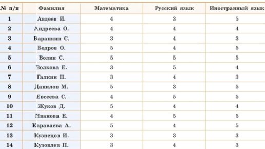 1. Найдите частоту всех значений ряда чисел: 23, 14, 19, 23, 10, 14, 10, 11, 10, 10, 19, 11, 10, 11, 11, 11, 10, 23, 11, 11 (ответ дать десятичной дробью). 2. В таблице даны четвертные оценки учащихся класса. а) Найдите частоты различных четвертных оценок по математике. Составьте таблицу значений и частот (ответ дать десятичной дробью, округлённой до тысячных). б) Вычислите среднюю оценку по математике за четверть. 3. Частоту букв в русском языке можно приблизительно оценить с помощью художественных и научных текстов...