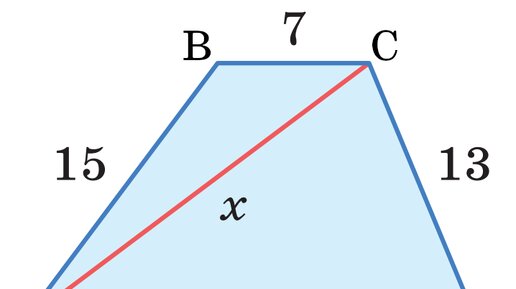 Задача: Основания трапеции равны  7 и 21, а  её  боковые стороны равны 13 и  15. Найдите диагональ трапеции, обозначенную буквой x  на  рисунке. ©Математическая Вертикаль. Учебное пособие для общеобразовательных организаций. Автор: М.А.Волчкевич. Решение: AD∥BC по определению трапеции ⇒ ∠BCA = ∠CAD как накрест лежащие при пересечении параллельных AD и BC секущей AC, обозначим их углами α. В △ACB по теореме косинусов: √(x^2 + 7^2...