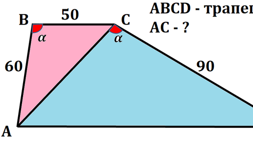 В этой трапеции известны боковые стороны и верхнее основание. Диагональ АС образует со стороной CD угол, равный углу трапеции АВС. Необходимо рассчитать длину диагонали АС.