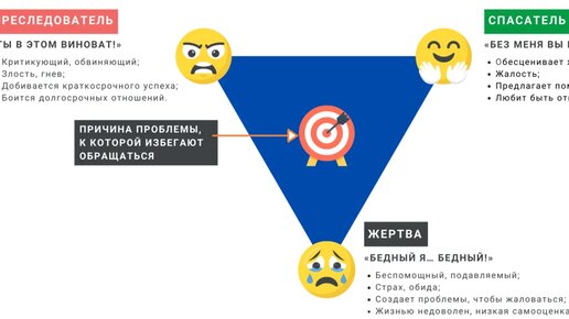 Каждый из нас хотя бы раз в жизни из-за чего-то страдал, верно? Вообще, в страданиях индивида нет ничего плохого или стыдного. Но если он страдает напоказ, привлекает внимание всех окружающих к своим страданиям и заставляет людей чувствовать себя виноватыми из-за недостаточной озабоченности его проблемами, то ситуация превращается в драматический треугольник (или треугольник Карпмана). Давайте разберёмся с этой геометрической фигурой – но не ради теоретического интереса, а для того, чтобы вы смогли...