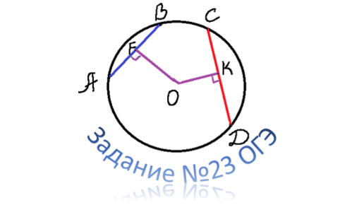 Здравствуйте, уважаемые читатели. В этой статье продолжим разбор задач из 23 задания ОГЭ по математике. Задача Отрезки AB и CD являются хордами окружности. Найдите длину хорды CD, если AB = 24, а расстояния от центра окружности до хорд AB и CD равны соответственно 16 и 12. Выполним построение чертежа и напишем условие Решение 1) Соединим центр окружности с концами хорд АВ и CD. Так как отрезки ОВ, ОА, ОК и КО равны как радиусы окружности, то получим два равнобедренных треугольника АВО и COD. 2) Рассмотрим треугольники АВО и COD, они равнобедренные...