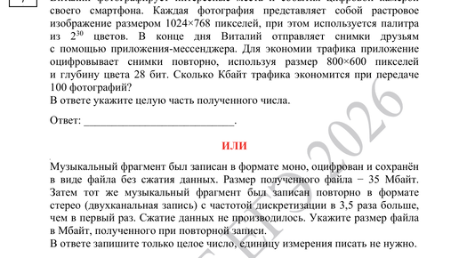 Задачи из демоверсии 2026 года по информатике с сайта ФИПИ. Формулы для решения задачи с графикой. N = 2**i I = K * i K = a * b Iобщ = I * n N - количество цветов в палитре i - вес одного пикселя в битах I - размер картинки, фотографии в битах K - количество пикселей в картинке, фотографии a - количество пикселей по горизонтали (по ширине) b - количество пикселей по вертикали (по высоте) Iобщ - общий объем в битах всех картинок, фотографий n - количество картинок, фотографий Формулы для решения задачи с аудио...