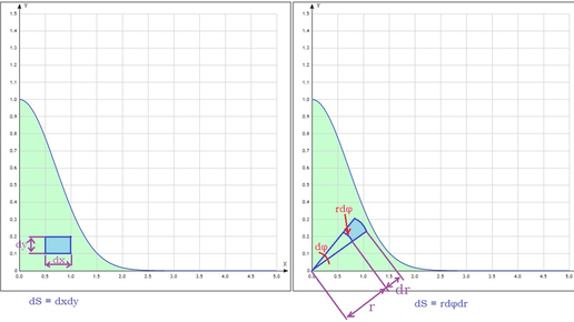 Данный интеграл берется от гауссовой функции: Пожалуй, легче всего найти этот интеграл с помощью перехода в полярные координаты. Построим график подынтегральной функции, который поможет нам определить пределы после перехода в другую систему координат. Здесь есть очень интересный математический способ. Чтобы найти исходный интеграл, сначала ищут квадрат этого интеграла, а потом от результата берут корень. Почему? Да потому что так гораздо проще и безболезненно можно перейти в полярный координаты...