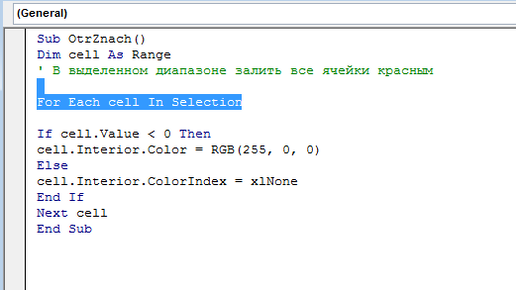 Добрый день, уважаемые читатели блога! В сегодняшней статье мы поговорим о быстром выделении отрицательных значений в выделенном диапазоне таблицы Excel. Первая мысль, которая приходит в голову — использовать условное форматирование. Мысль правильная, но действий придётся выполнять слишком много. Рассмотрим вариант с использованием макроса. Имеем таблицу с данными, в ней нужно найти и подсветить все отрицательные значения. Теперь добавим новый модуль: Перед нами появится окно модуля, куда нужно вставить следующий код...