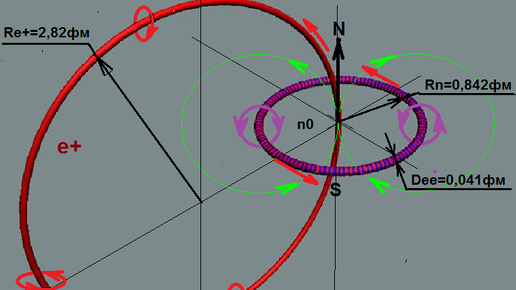 Структурно протон р+ состоит из тора нуклона n0 и одного кольца позитрона е+, прошивающего тор нуклона по центру его вращения см. рис. 1. Тор нуклона n0 имеет радиус Rn ≈ 0,842 фм и диаметр трубки нуклона Dе-е+≈ 0,041 фм. Тор нуклона n0 электрически нейтрален, его заряд = 0, ибо он состоит из электрон-позитронных пар е- и е+ взаимно нейтрализующих свои заряды. Кольцо положительно заряженного позитрона е+ придаёт протону р+ положительный заряд. Кольцо позитрона е+ в протоне р+ имеет радиус Rе+...