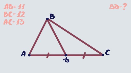 Если дочитали прошлую заметку, то точно умеете (в одно действие) и откуда она выводится тоже знаете. Так вот Вам и проверка — найти медиану по трём известным сторонам. По формуле искать совсем не обязательно, можно и своим способом. Ниже условие — очень короткое, понятное и простое. Условие Стороны треугольника равны 11, 13 и 12...