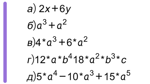 Рассмотрим несколько примеров вынесения общего множителя за скобки, чтобы стало понятнее, как это делать. Пример 1. Задача разложить многочлен на множители Решение Здесь мы вынесем за скобки общий множитель, в данном случае 2 Если у нас в многочлене присутствует 1 и более переменных, то её мы можем вынести за скобки (переменную нужно брать с наименьшей степенью в дроби) в) В следующем примере мы применили навыки двух предыдущих примеров таких как вынесение общего числа за скобки и общей переменной...