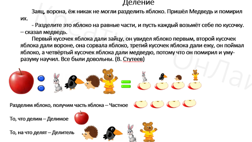 Деление с помощью сказок и историй детям понятнее. Объясним образно: Если ребёнок составит себе памятку в виде образов и будет обращаться к ней часто, то она легко запомнится в памяти. Составим красивую интерактивную тетрадь с картинками, вкладышами, окошечками...