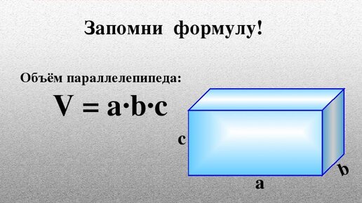 1. Для прямоугольного параллелепипеда формула для нахождения объема имеет вид: V = a*b*c, где a, b и c – это длины сторон параллелепипеда.