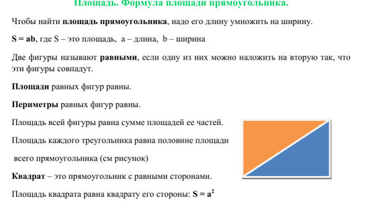 S = ab, где S – это площадь, a – длина, b – ширина Две фигуры называют равными, если одну из них можно наложить на вторую так, что эти фигуры совпадут...