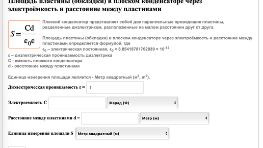 Площадь пластины (обкладки) в плоском конденсаторе. Калькулятор онлайн.