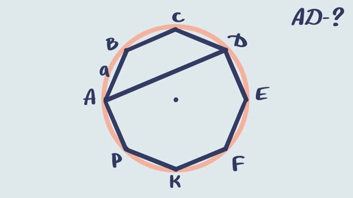 Тех, кто занимается по учебникам геометрии для 9-го класса автора А.Г. Мерзляк, уже в скором времени ждёт контрольная. Последней задачей в этой контрольной вполне может оказаться наш экземпляр, это задание из дидактики к учебнику. Далее условие и несколько подсказок «для сомневающихся», если Вы не такие, то не читайте их 🤷♂️ Условие Найдите диагональ AD правильного восьмиугольника ABCDEFKP, если AB = a. Подсказки Вообще решений хватает, двух будет предостаточно, думаю...
