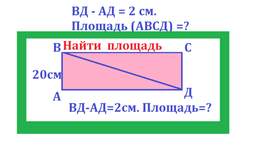 Приветствую читателей статьи и подписчиков канала! Это одна из очень интересных задач по геометрии по определению площади прямоугольника по одной заданной стороне, а об остальных сторонах и диагонали сказано, что их разность равна 2 см. Не сказано даже о том, что все параметры - целые числа. А так оно и есть, числа все целые. Но это совсем даже не важно. Не целые числа определяют решение задачи. А только данные, что сторона равна 20 см, а разность другой стороны с диагональю равна 2 см. Решать можно по-разному...