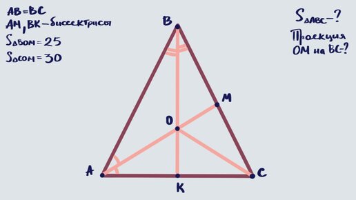 Треугольник для разнообразия и никаких трапеций. Ещё метод площадей или пропорциональные отрезки или всё это вместе в одной непростой, но интересной задаче для подготовки к ОГЭ Тут и свойство биссектрисы, и свойства (оба) равнобедренного треугольника, и отношение сторон (площадей), и даже «египетский» треугольник. читайте условие, если недостаточно — в конце подсказки тоже читайте. Условие В равнобедренном треугольнике ABC (АВ = ВС) биссектрисы AM и ВК пересекаются в точке О. Площади треугольников ВОМ и СОМ соответственно равны 25 и 30...