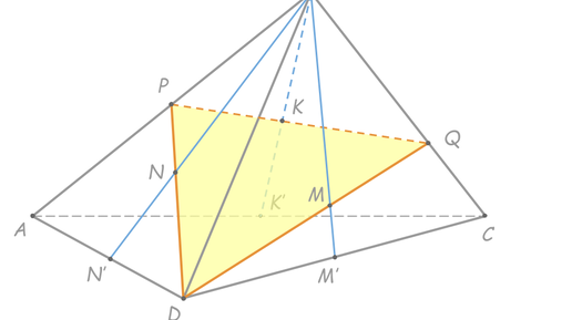 Задача 14 (223 вар. Ларина) Точки P и Q расположены на ребрах тетраэдра ABCD так, что P — середина AB, BQ : QC = 3 : 2. Через вершину D, точки P и Q проходит плоскость, пересекающая в точках X, Y и Z медианы граней ABC, BCD и ABD, соответственно, медианы проведены из точки B. а) Докажите, что площади треугольников KMN и DPQ относятся как 5 : 22. б) Найдите отношение объемов тетраэдров CKMN и ABCD. https://alexlarin.net/ege/2018/trvar223.pdf Указания к решению а) Рассмотрим △APD...