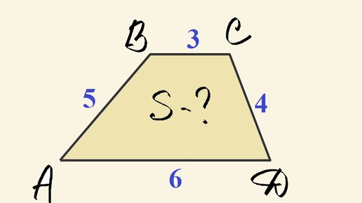 АВСD трапеция с известными сторонами (на чертеже)/ Надо найти площадь этой трапеции. При этом помним, что чертёж задачи не обязательно соответствует действительности. То есть может быть эта трапеция прямоугольная или вообще один из углов основания тупой...