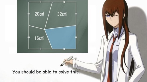 Дан квадрат. В квадрате есть точка с неизвестными координатами. Эта точка соединена отрезками с серединами всех сторон квадрата. Найти площадь закрашенной области (четырехугольника), если площади других области равны 16, 20 и 32 квадратных сантиметра...