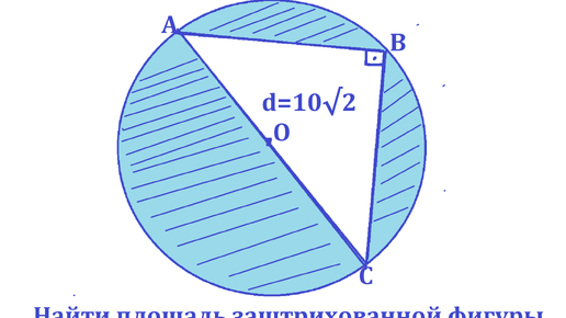Приветствую читателей статьи и подписчиков канала! Рассмотрим ещё одну задачу из программы ЕГЭ. Рассмотрим геометрическую задачу из программы ОГЭ. Задача. Найдите площадь заштрихованной фигуры (изображённой на рисунке). О- центр окружности диаметром d = 10√2. AB = BC. Ход решения такой задачи можете писать в комментариях. Но желающие ознакомиться с планом решения, для вас два вида публикаций, приведённые дальше...