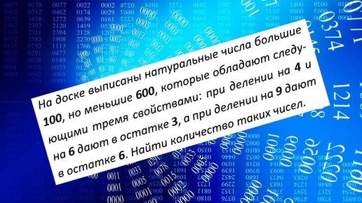 На доске выписаны натуральные числа большие 100, но меньшие 600, которые обладают следующими тремя свойствами: при делении на 4 и на 6 дают в остатке 3, а при делении на 9 дают в остатке 6. Найти количество таких чисел. Эта задача была предложена в 2015-16 гг. на первом этапе репетиционного тестирования по математике в Беларуси. Входила в блок сложных задач под номером В12. Решение. Найдем подбором наименьшее число большее 100, которое при делении на 9 дает остаток 6: 105. Все остальные числа, удовлетворяющее этому условию, образуют арифметическую прогрессию с разностью 9...