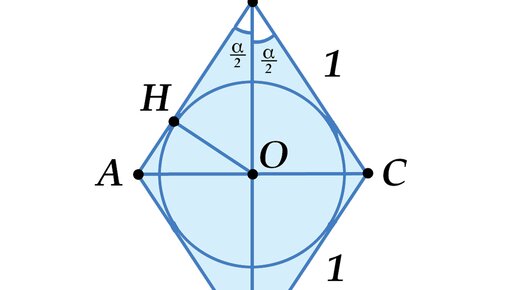 Задача: В ромб с острым углом α вписали окружность. Найдите её радиус, если сторона ромба равна 1. ©Математическая Вертикаль. Учебное пособие для общеобразовательных организаций. Автор: М.А.Волчкевич. Проведём диагонали в ромбе, по свойству ромба диагонали пересекаются друг с другом под прямым углом, а также являются биссектрисами углов, отсюда ∠ABO = ∠CBO = α/2 (см. рисунок). OH = BO * sin (α/2); BO = AB * cos(α/2) = cos(α/2) ⇒ OH = sin (α/2) * cos(α/2)...
