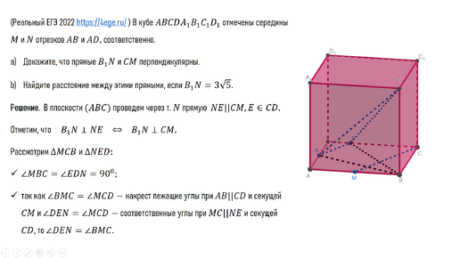 Пусть заданы две скрещивающиеся прямые a и b и неизвестно положение их общего перпендикуляра. В этом случае поиск расстояния по определению проще заменить на эквивалентную задачу: Рассмотрим задачу II-ой части ЕГЭ по профильной математике в качестве примера применения данной идеи. Пункт a) можно доказывать разными способами, например. Доказательство п. a) более трудоемкое, но упрощающее решение п...