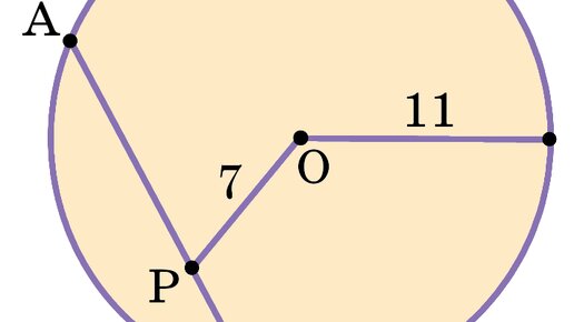 Задача: Точка P удалена на расстояние, равное 7, от центра окружности радиуса 11. Через точку P проведена хорда, равная 18. Найдите отрезки, на которые делится хорда точкой P. ©Математическая Вертикаль. Учебное пособие для общеобразовательных организаций. Автор: М.А.Волчкевич. Решение: Поскольку расстояние от центра окружности до точки P равно 7, а радиус той же окружности равен 11, то точка P лежит в окружности. Тогда по св-у степени точки внутри окружности AP * BP = R^2 - OP^2 = 11^2 - 7^2 = 72...