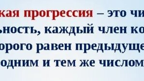Примеры: 1) 2; 4; 6; 8; 10; ... В этой числовой последовательности каждый следующий член равен предыдущему, сложенному с одним и тем же числом: 2. Значит, d = 2 - разность арифметической прогрессии. Так как каждый её член больше предыдущего, то прогрессию называют возрастающей 2) 17; 11: 5; -1; -7; ....В этой числовой...