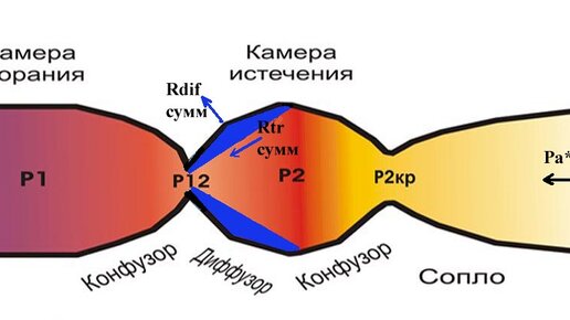 При выводе формулы тяги считается, что внутреннее пристеночное давление абсолютно одинаково действует как на поток продуктов сгорания, так и на внутренние стенки РД только на участках безотрывного течения потока. Кроме того, рассматривается только случай дозвукового течения в диффузоре. Очевидно, что в зоне отрыва основной струи (обозначена синим цветом) пристеночное давление действует на стенку и вихревые струйки, образовавшиеся здесь. На основную же струю в этой зоне пристеночное давление напрямую не действует...