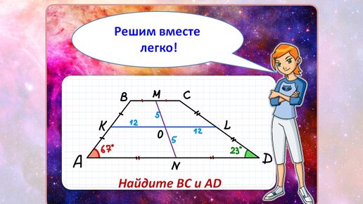 Не так давно выкладывал задачку, на которую пришло немало откликов-решений. Спасибо всем! Давайте разберем ее подробно. Вот она: Итак, условие задачи. Дана трапеция ABCD. Отрезки, соединяющие середины сторон равны соответственно: KL=24, MN=10. Найдите основания трапеции. В первую очередь полезно обратить внимание на углы. Если они настолько "нестандартные", значит, это кому-то нужно! То есть нам! Посмотрим, что будет, если бы 2 таких угла имел треугольник. Каким был бы тогда его третий угол? 180...