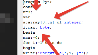 Задача 1. Массив А вводится с клавиатуры. Найти сумму его элементов. Размер произвольный. const n=3; var a:array[1..n] of integer; i,s:integer; begin s:=0; for i:=1 to n do begin write('Введите a[',i,']='); readln(a[i]); s:=s+a[i]; end; writeln('S=',s); end. Задача 2. Массив А вводится с клавиатуры. Найти среднее арифметическое его элементов с нечетными номерами. Размер произвольный. const n=5; var a:array[1..n] of integer; i,ind:integer; s,sr:real; begin for i:=1 to n do begin write('Введите...