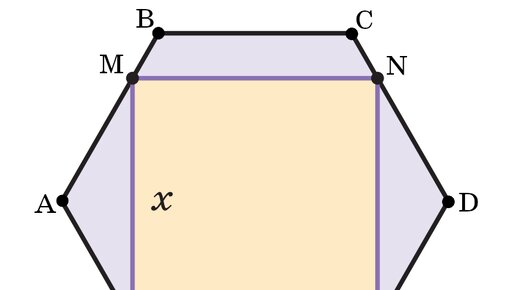 Задача: Сторона правильного шестиугольника равна 1. Найдите сторону квадрата, вершины которого лежат на четырёх сторонах шестиугольника, а стороны параллельны диагоналям шестиугольника. ©Математическая Вертикаль. Учебное пособие для общеобразовательных организаций. Автор: М.А.Волчкевич. Решение: Продлим AB и CD до пересечения в точке G. ∠GBC =180° - ∠ABC = 180° - 120° = 60°, ∠GCB = 180° - ∠BCD = 180° - 120° = 60° ⇒ △BGC - равносторонний ⇒ BG = CG = BC = 1. (см рисунок) По св-у правильного шестиугольника противоположные стороны параллельны большей диагонали ⇒ BC∥AD...