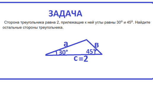 Приветствую читателей и подписчиков канала Тесты_математика! Рассмотрим, насколько сложна, или наоборот простая геометрическая задача, решать только читателям. Задача. Сторона треугольника равна 2, прилежащие к ней углы равны 30° и 45°. Найдите остальные стороны треугольника. Как проще решить такую задачу? Пишите в комментариях...