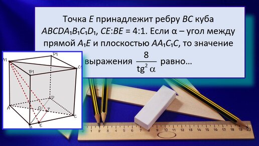 Точка E принадлежит ребру BC куба ABCDA₁B₁C₁D₁, CE:BE = 4:1. Если α – угол между прямой A₁E и плоскостью AA₁C₁C, то значение выражения 8/tg²α равно… Задача централизованного тестирования 2021 года. Вариант 6. Задача В9. Решение. Из точки E опустим перпендикуляр на плоскость AA₁C₁C. Плоскости ABCD и AA₁C₁C перпендикулярны, поэтому EP лежит в плоскости ABCD. Пусть P основание этого перпендикуляра. У квадрата...