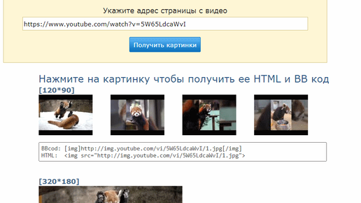 В результате вы получите превью всех доступных картинок для данного видео. Нажав на любую картинку вы получите его HTML - ВВ коды для их использования в своих блогах или форумах.