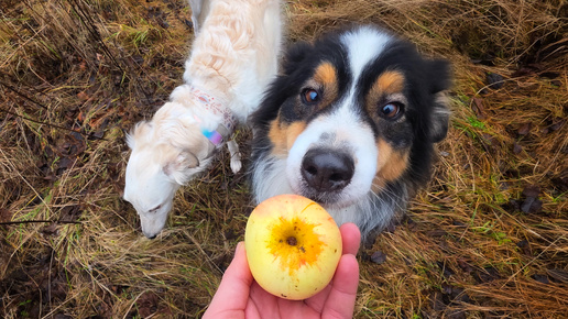 Мы сегодня с умной и спокойной частью стаи ходили Диму выручать, который пошёл на пасеку и случайно сам себя запер в зимовнике, куда мы в ноябре унесли пчел. Дорога на пасеку Участок с пасекой находится в 400 метрах от нашего дома, потому мы туда каждый день ходим туда что-то посадить, понаблюдать, построить и далее по списку. Яблок в этом году море. 5 декабря, на улице +3 и вот такие ароматные фрукты висят еще на ветках. Собаки этой осенью просто с ума сошли - выпрашивают яблоки настойчиво как никогда...