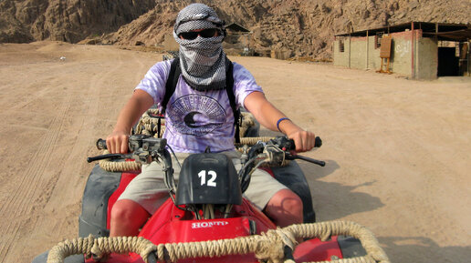 Посетив кучу культурно-исторических достопримечательностей в Каире и Александрии, в Шарме мы решили только отдыхать. Но через какое-то время бесцельное валяние на пляже и сидение в баре надоело, но желание опять поехать смотреть монастыри не появилось. Тогда мы решили отдыхать более активно. По пляжу ходил молодой человек спортивного вида и предлагал различные пляжные развлечения. Ну и втихаря впаривал околоспортивные экскурсии гораздо дешевле, чем гиды в отеле. Через него мы и взяли покатушки на квадроциклах по 20 долларов с человека...
