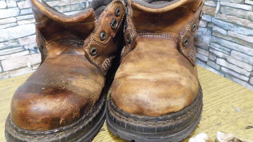 Ссылки на дополнительные материалы - в конце статьи. Ботинки старые, заслуженные. Прошли не одну тысячу километров. И владелец желает, чтобы прошли ещё столько же. Дефектов здесь несколько, есть критичные, но не фатальные. Прежде всего - это кожа верха. А также естественный износ низа обуви. Накат (профилактику) уже ставили. Ей, видимо, пытались заклеить трещины подошвы. Каблук тоже сношен до состояния "давно пора". Но если это как бы не видно, то кожа верха - это то, что на виду. Здесь уже хватило всего - и старого крема, и пыли/грязи, и реагентов...